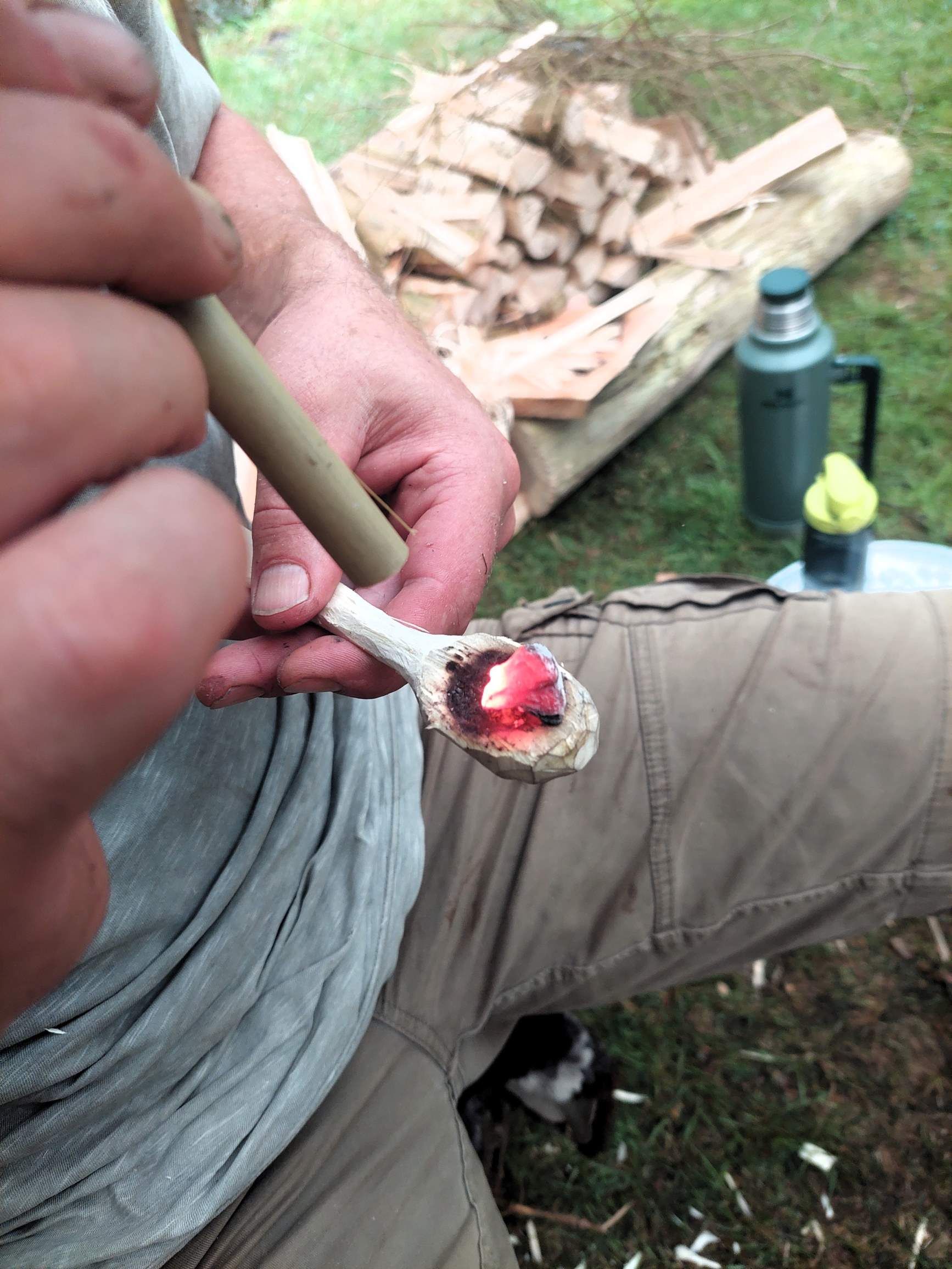- Het snijden van een houten lepel (met hulp van het vuur)